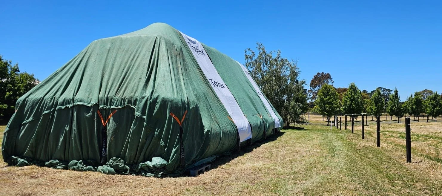 TOPTEX® covers provide a breathable, strong, and long-lasting solution for protecting outdoor hay and straw bales from the elements while maintaining feed quality much better than traditional plastic tarps.
